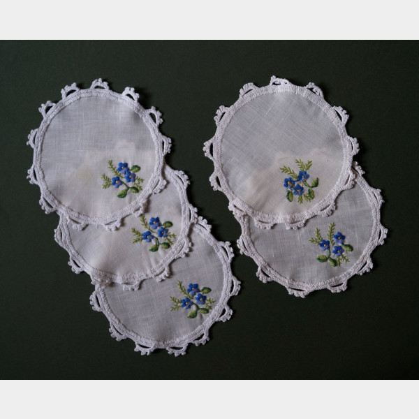 Prezenty / Motyw niezapominajki, haft atłaskowy płaski, len, brzegi wykończone koronką szydełkową