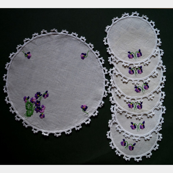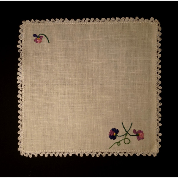 Prezenty / Motyw fiołki, haft atłaskowy płaski, brzegi wykończone koronką szydełkową, len